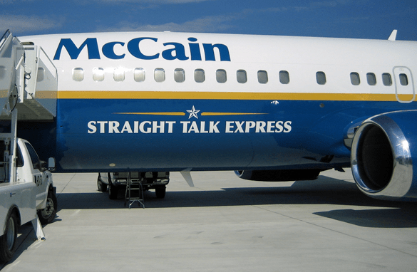 It was another combative day in the battleground state of Missouri. As I was turning into the plant gate this morning I saw McCain’s plane (Boeing 737) parked across the tarmac. The picture above is from the Internet. He had a rally planed at New Town in St. Chuck county. New Town is a planned community that has been built out near the floodplain. It survived this years floods, but I doubt that it is high enough to survive another 1993. Local news had him speaking in front of a ticketed crowd of 3,000.