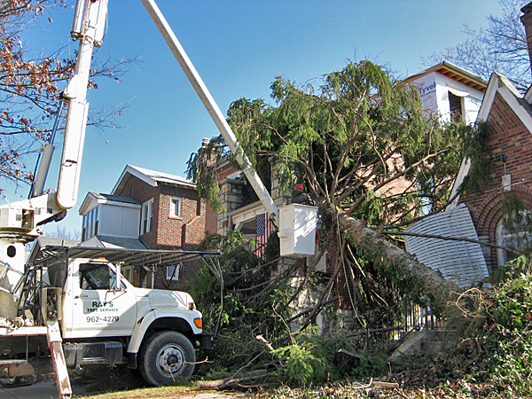 On Tuesday Ray’s Tree Service showed up to remove our tree. I, (Anne), took over a hundred pictures of the process, and the damage that was more fully revealed when the tree was gone. Fortunately, the damage still looks fairly minimal, especially compared to the neighbors’ house behind us.