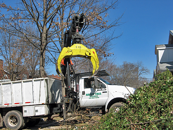 For a while the tree guys had tied a rope around the trunk and wrapped it over the cherry picker and around our standing tree. Apparently this method of raising the trunk off the neighbor’s balcony wasn’t going to work, so they went to Plan B. They moved the cherry picker out of the driveway, and then moved in “The Claw”. With “The Claw” holding the trunk in place, and a safety rope, they were able to chain saw through the trunk and lift the upper portion off our neighbor’s house. “The Claw” grabbed each successive piece as it was cut free and swung it around to the truck. Finally, “The Claw” grabbed the stump and pulled it free from the grip of the ivy, leaving a loverly heffalump trap. I kept one round of the trunk from near the base. I will count the rings and see how old the tree was. After lunch, the tree crew ran all the branches through the chipper and used a leaf blower on the driveway and sidewalks, and drove off to their next job. Thanks, guys, you did a great job!