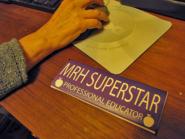 Anne is pictured above with her symbol of recognition, a chocolate bar. This is in response to the success of the standardized testing team. They succeeded in getting every student tested, save one, leaving almost no child left untested. It is always nice to receive recognition for a job well done. Being recognized with chocolate is even better. On another subject, Anne finished one knitting project and began another one this week. I can’t show any pictures, because both are intended to be Christmas presents.