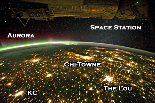 The above photograph is a NASA picture, taken from the International Space Station (ISS). Taken on a crystal clear night,it shows the American northern Midwest. Above and behind the Midwest is the Aurora Borealis and a portion of the ISS. You might think of this as the moon’s view of us.