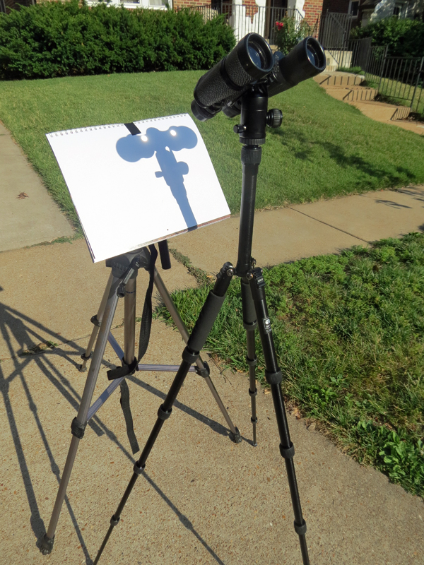 I captured the above passable photograph of the transit of Venus across the face of the Sun. Venus is the black dot near the bottom of the disk of the Sun. The picture was taken somewhere after about an hour after the transit had begun. At about 6:30, I packed it in, because it looked like the sun was going to set below the houses across the street. The Sun is an oval, because I had to shoot the picture at an oblique angle, so as not to block the image of the Sun. The below photo shows my rig, two tripods, a pair of binoculars and a white sheet of paper, all held together with electrical tape. I did this in front of the house, so a few of the neighbors stopped to see what I had. It was hot standing out in the June Missouri sun.
