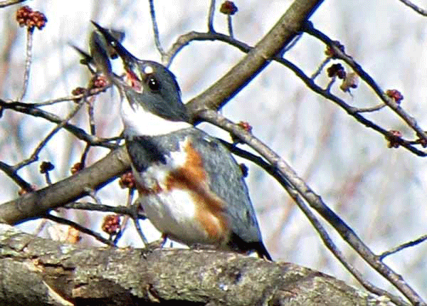 While we were standing around, wondering where the owl was, this kingfisher showed up and hung around long enough to gobble up its freshly caught fish. We saw this bird manifest the same behavior that the woman yesterday described to me. The kingfisher would smack the fish against the tree branch, I guess to stun it. I’ve compiled some of the photos into an animated GIF, to better convey this bird’s dining process. The following sound clip was recorded earlier and is included to let you know what to listen for. Kingfishers have a very distinctive call and are easier to find and track audibly than they are visually.