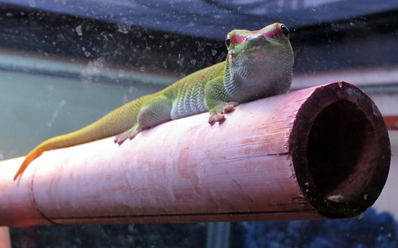 When I was just a wee tot and was living on the tropical island of Guam, we would have geckos crawling across the dining room ceiling during dinner. This always drove my Mom crazy, but it also amused both my brother and I. This particular gecko is in the Climatron at the Missouri Botanical Gardens. Those spots on the glass are from his footprints.